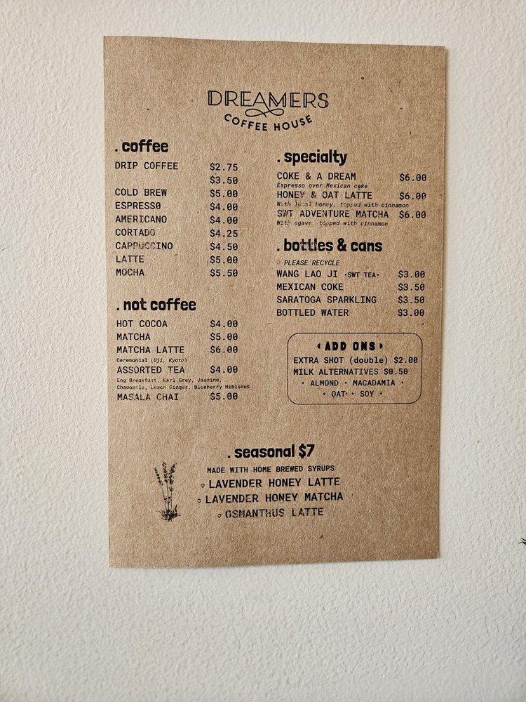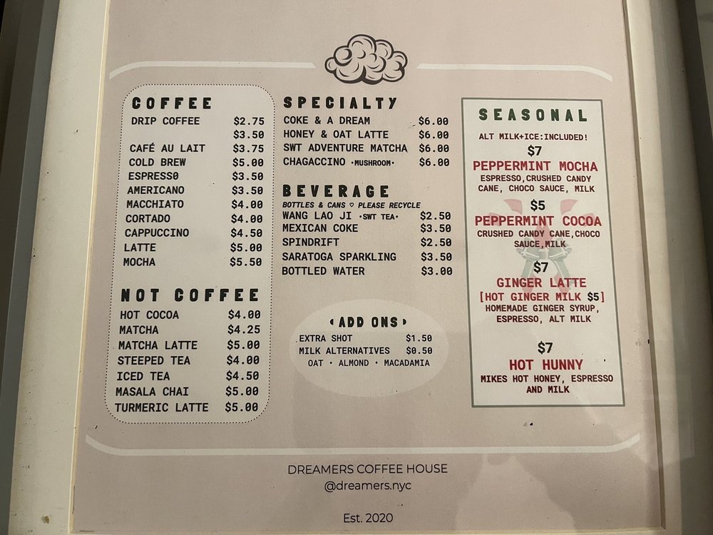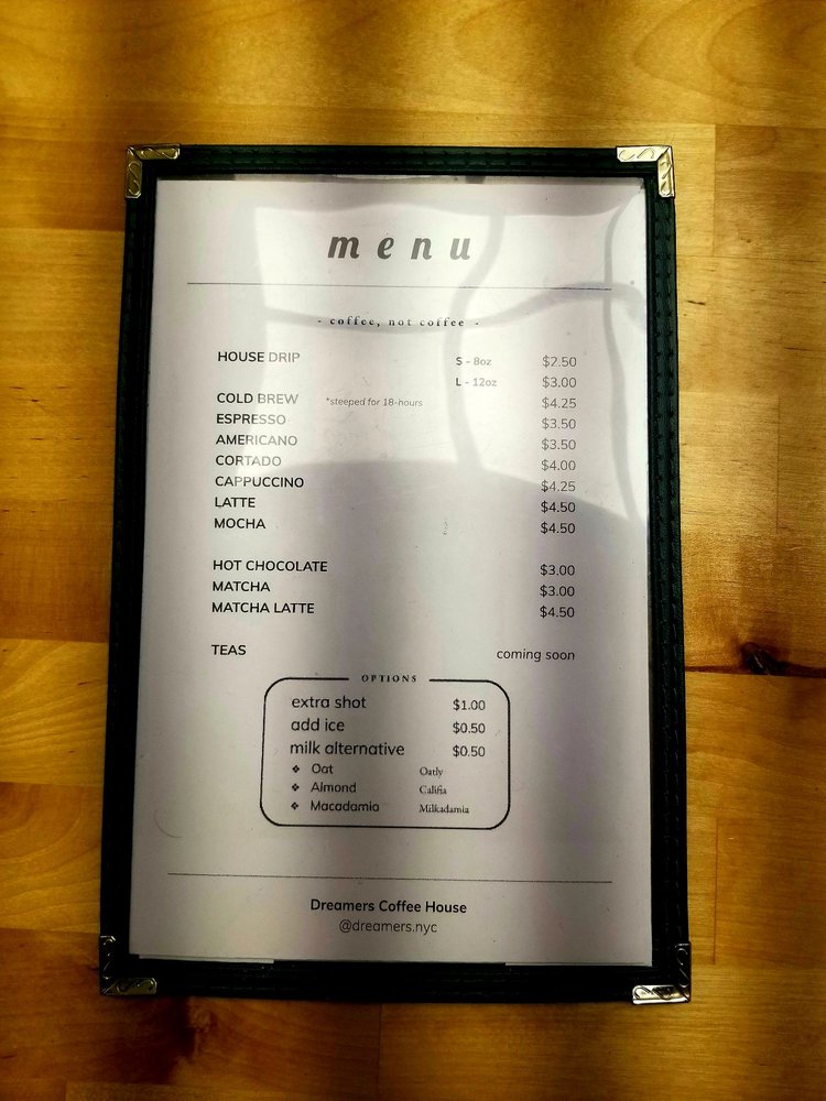 Dreamers Coffee House is a cozy cafe located near China Town in New York City. Specializing in cupcakes, desserts, and a variety of coffee and tea options, this Asian-owned establishment offers a unique and diverse menu. Customers rave about their seasonal flavor combinations, such as the rosemary brown sugar latte and the maple latte, which can be customized to suit individual preferences. The iced coffee at Dreamers Coffee House is a standout, with patrons praising its smoothness and rich flavor profile. The cafe provides a welcoming atmosphere, with both indoor and outdoor seating options available. With friendly service and a commitment to sustainability (offering cute reusable cups), Dreamers Coffee House is a must-visit spot for coffee enthusiasts looking for a memorable and delicious experience in the heart of the city.
